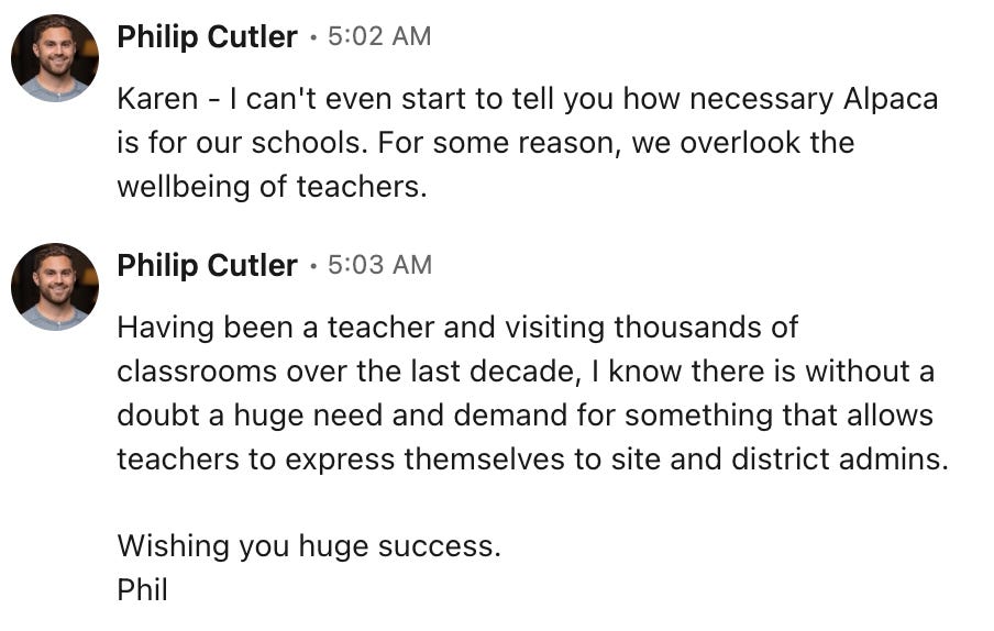 This was an eye-opener for me. I said in the conversation “no one really asks teachers how they’re doing, or does surveying about wellbeing.” Phil didn’t move swiftly to Alpaca Pulse or our offerings, he asked this: “Why do YOU think that is?”