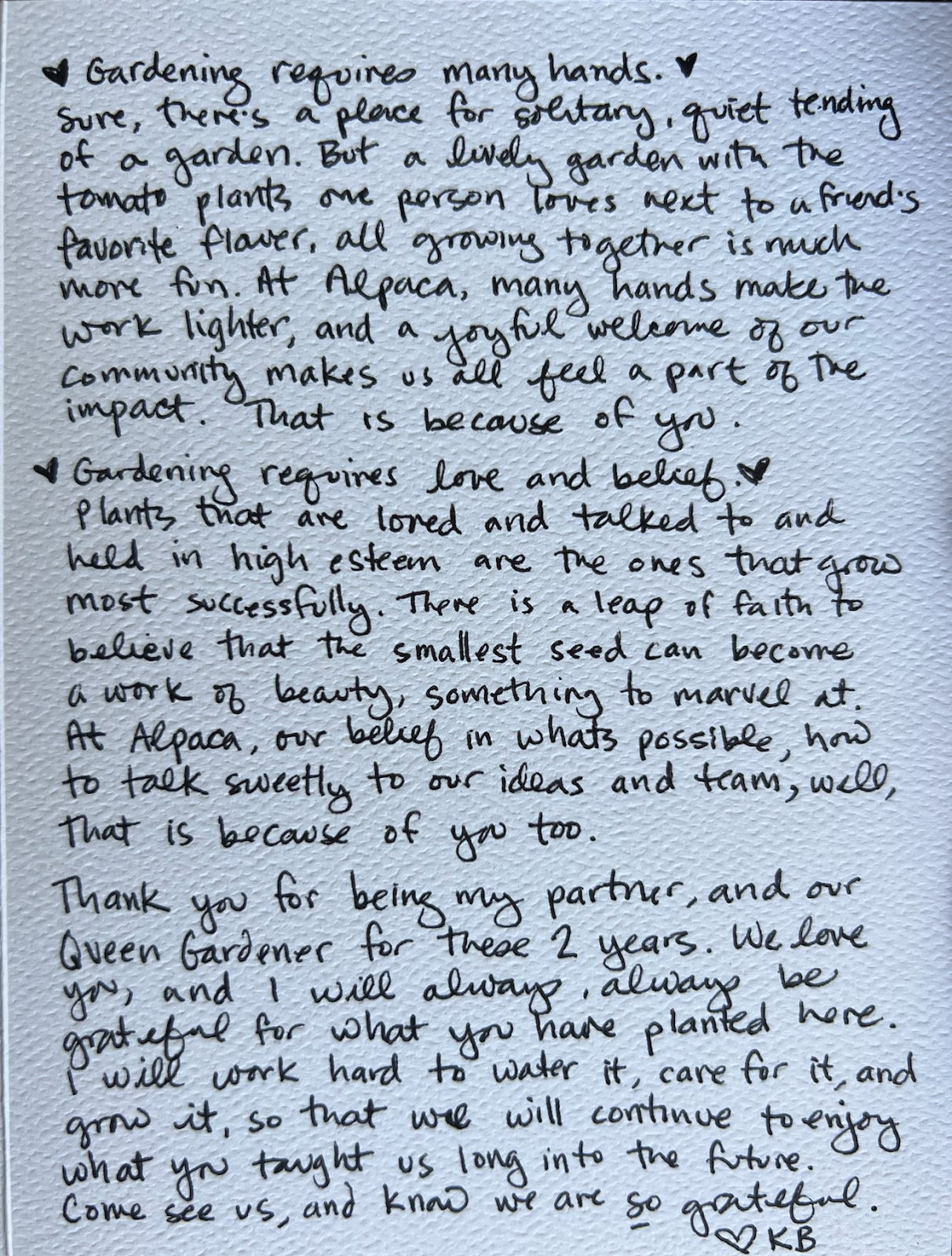 Today, I want to recognize and thank our dearest Head of Operations Marina Erickson for her 2 amazing years of incredibly hard work at Alpaca. You know I’m all about handwritten notes, so with her permission, today’s team letter comes to you directly from the note I wrote to Marina today, her last day with our team.