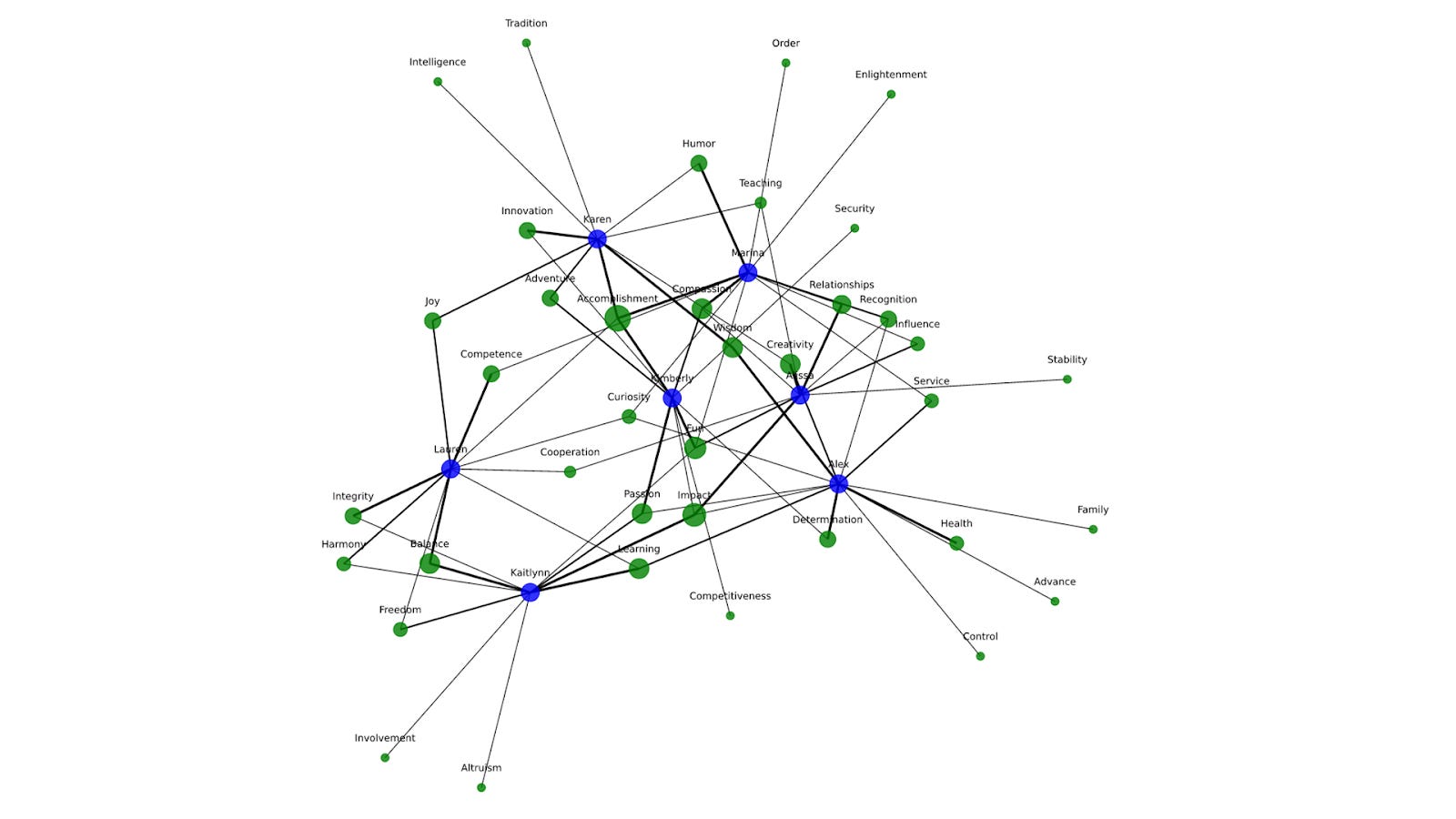 I was dying to know where there was the most overlap in people’s values. Overlapping values might mean that those people think about things in similar ways, have similar motivations, or just work really well together. I loved to see where people overlap! Before you keep scrolling, take a guess! Who do you think overlapped the most?