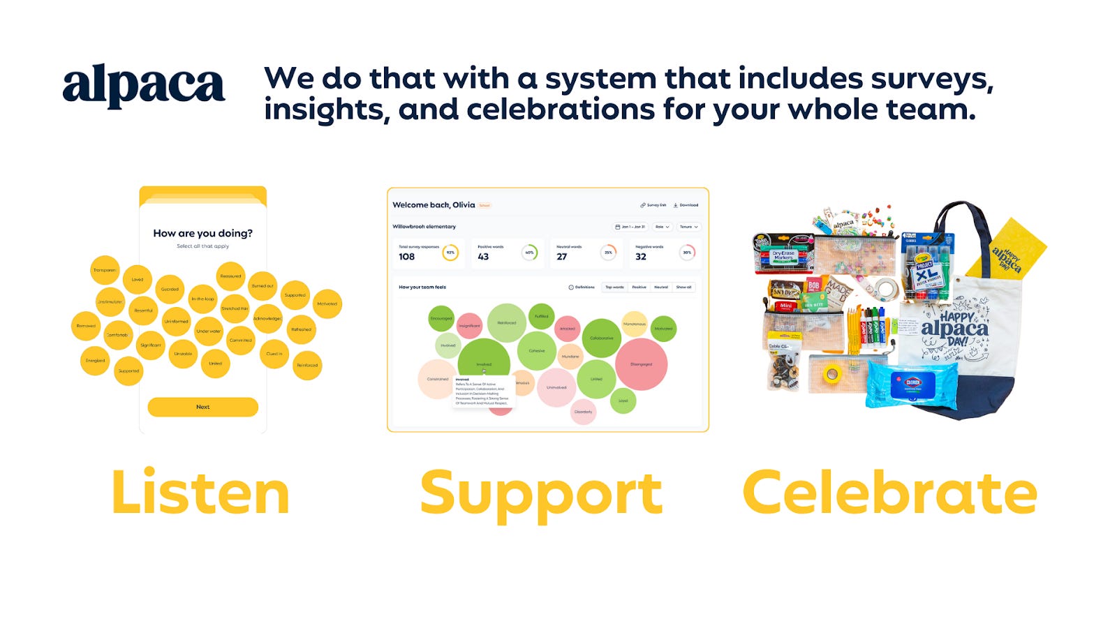 Most Alpaca schools combine these ideas into a simple system – regular surveys to listen, resources and insights to provide support, and delightful gifts to celebrate!