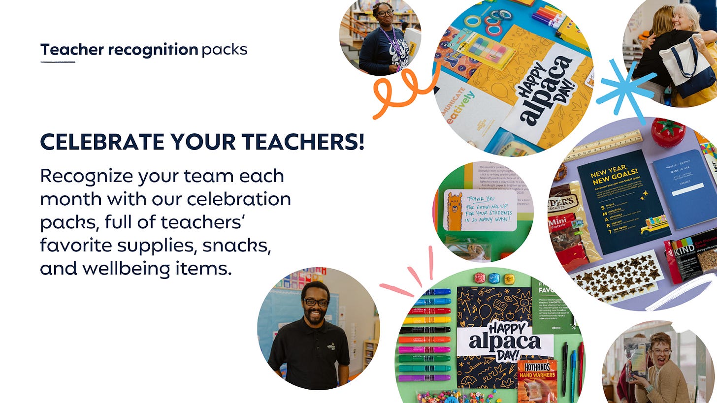 Now that you’re armed with great data and insights, let’s show your teachers some love! Alpaca’s celebrations give you turn-key ways to delight and thank your staff – no assembly required.