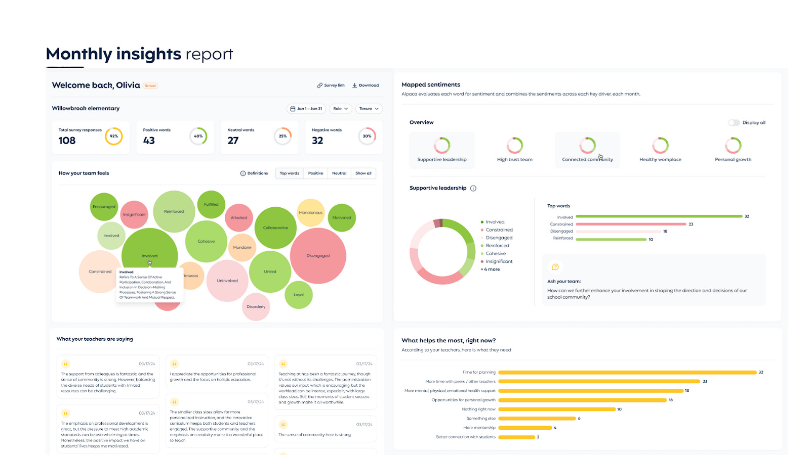 On our side, Alpaca has encoded these words across overall sentiment (positive to negative) as well as across our five drivers. This helps us show you which words teachers are using to describe work, and how those words align to those drivers of teacher wellbeing. That way, you know where to focus, and where to celebrate!