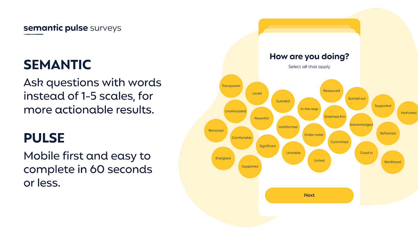 Our system starts with SEMANTIC PULSE SURVEYS, a different way of asking your team how they’re doing.