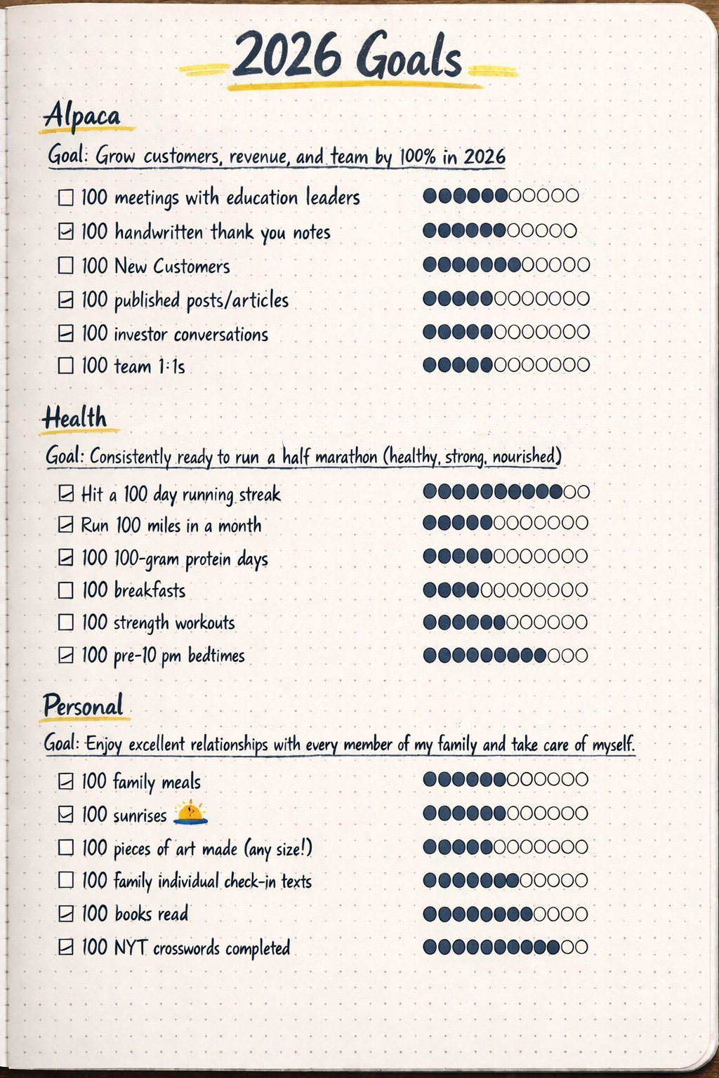 Coming into the year, I wanted my own personal goals to align to our company goals, since a lot of my hours and days and weeks are centered on Alpaca (as they should be!). So I built myself a little program to make that consistent effort fun, and to celebrate some Little Wins.