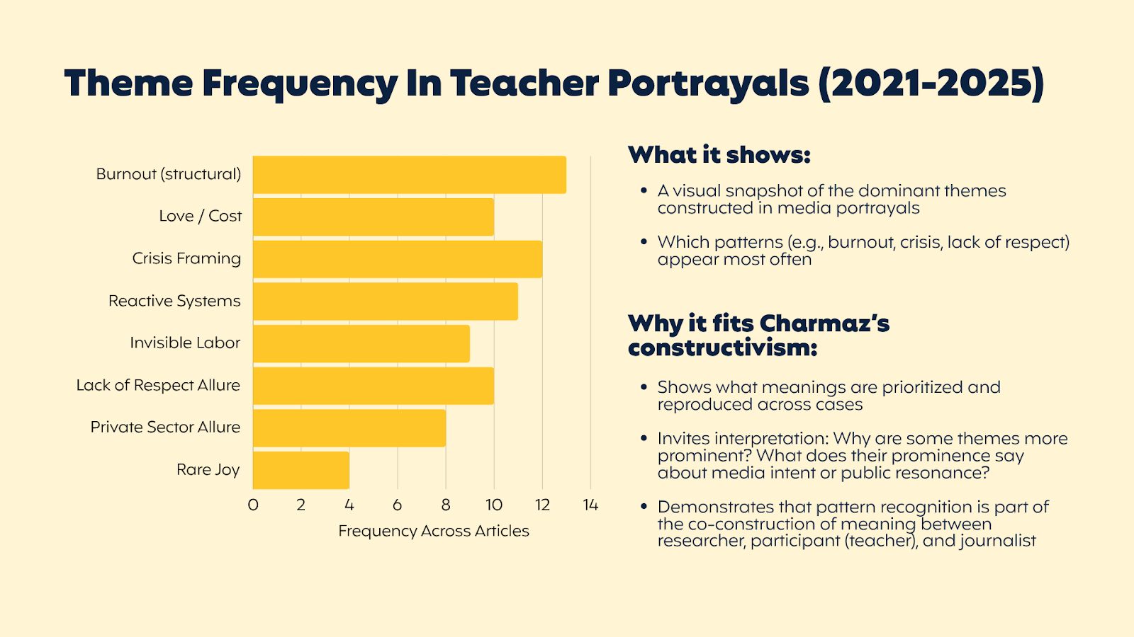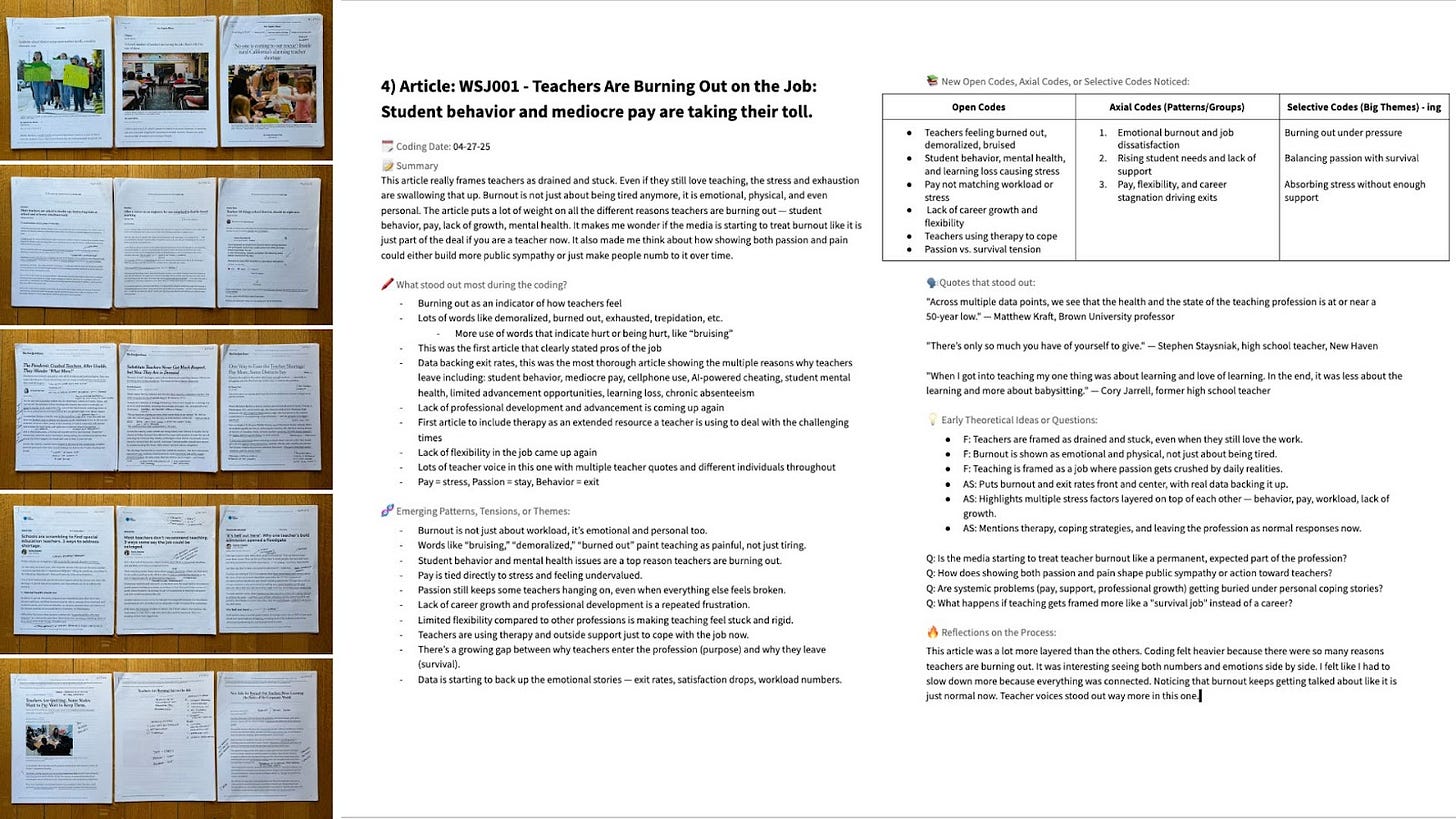 I analyzed 15 articles about teachers published between 2021 and 2025 in The New York Times, Washington Post, USA Today, Wall Street Journal, and LA Times. These weren’t quick blurbs. They were in-depth, narrative-style features that met a specific set of inclusion criteria: each one focused on K–12 teachers, included direct quotes from educators, and offered enough emotional and narrative depth to analyze how teachers were portrayed in public discourse.